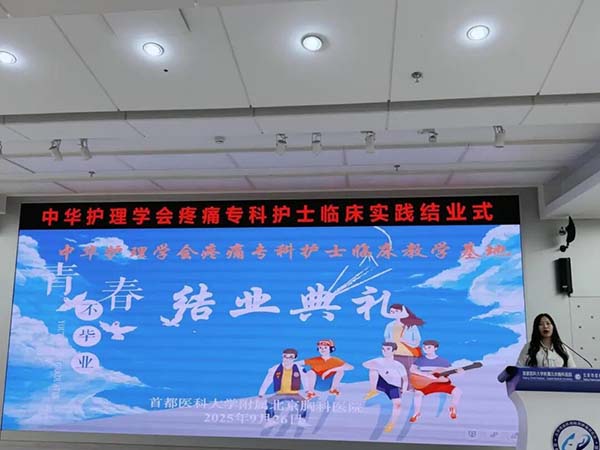 北京胸科医院肿瘤中心主任林根在结业典礼上向4位学员提出寄语与期望。同时指出疼痛作为第五大生命体征,疼痛护理在患者管理及康复中具有重要意义,疼痛专科护士培养肩负着守护患者健康的重要使命,其意义非凡且影响深远。强调了此次疼痛专科护士培训更是教学相长、共同进步的宝贵契机,不仅帮助学员夯实专业基础,掌握操作技能,也为教学基地积累了丰富的教学经验。