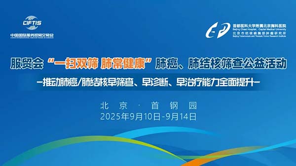 为推动肺癌、肺结核防治关口前移,提高人们对肺癌、肺结核早发现早治疗的健康意识,让群众体验人工智能的便利医疗服务,在北京市卫生健康委员会、北京市疾病预防控制局的指导下,首都医科大学附属北京胸科医院将于2025年9月10日-14日在中国国际服务贸易交易会(首钢国际会展中心2号馆旁)开展“一扫双筛 肺常健康”肺癌、肺结核筛查公益活动。
