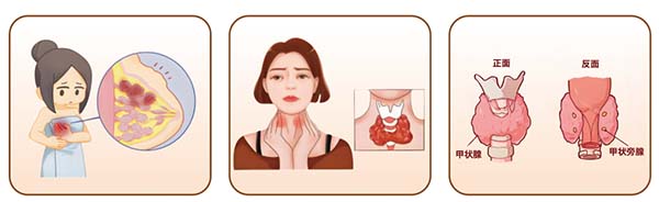 ● 甲状腺疾病:良性甲状腺结节、甲状腺恶性肿瘤,甲状腺功能亢进、甲状腺功能减低,甲状腺炎,异常颈部淋巴结肿大等。