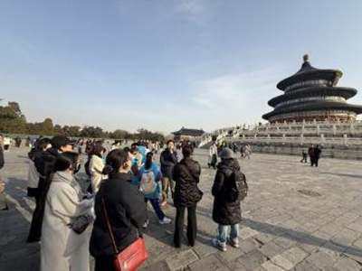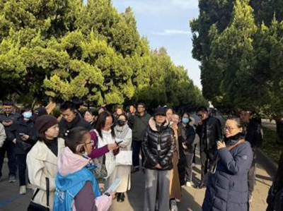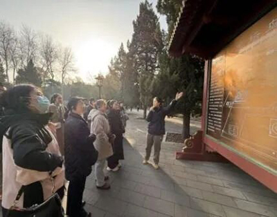 活动当天,在天坛公园宣教中心罗竹茜同志的引领下一行人从天坛公园北门步行至祈年殿。道路两侧的苍松翠柏宛如威武的士兵,守护着这座雄伟壮观的千年古建筑群。天坛公园内有各类树木6万余株,仅古松、古柏和古槐的数量更是高达3500余株,累计观测记录到的野生鸟类种类多达240余种。祈年殿,是一座圆形三重檐攒尖顶式建筑,无论是其深厚的文化内涵,还是独特的建筑结构,在传统建筑中都占据着无可替代的历史地位。古树与古建筑交相辉映,共同营造出天坛庄重肃穆、静谧深远的独特氛围。