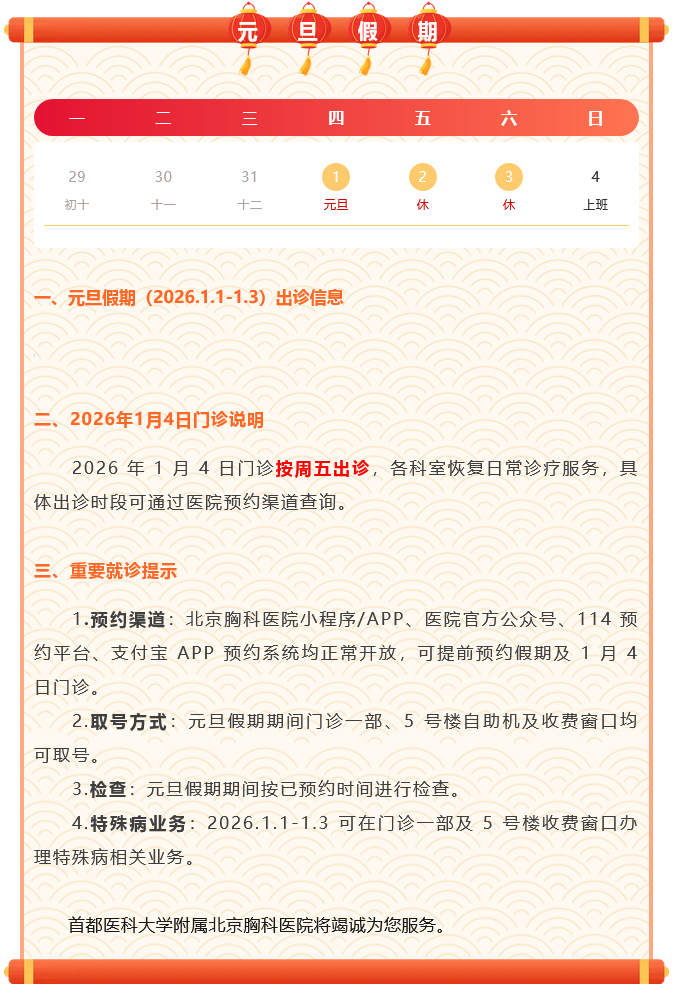 首都医科大学附属北京胸科医院 2026 年元旦假期(2026.1.1-1.3)及1月4日门诊信息表