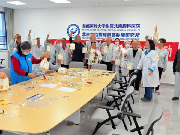岁末将至,年味渐浓。为帮助肿瘤患者缓解治疗压力、感受节日温暖,在2025年元旦来临之际,首都医科大学附属北京胸科医院医务社工团队与肿瘤中心医护团队为肿瘤患者及家属精心策划了“点亮心灯,喜迎新春”手工灯笼小组活动。12月26日,医院医疗综合楼8层笃行会议室被五彩气球装扮得温馨喜庆,医务社工、医护人员、志愿者与肿瘤患者及家属齐聚一堂,共赴一场充满希望与温情的手工之约。