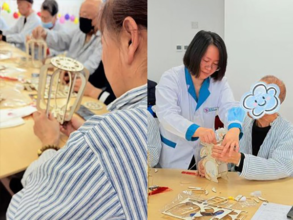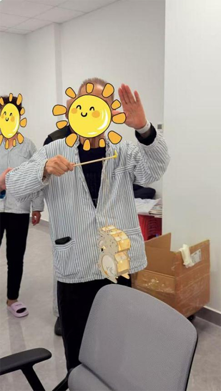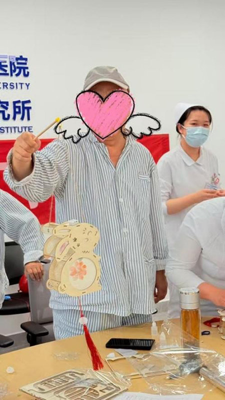 在灯笼制作环节,社工与志愿者将提前准备好的花草纸、木质配件等安全易操作的材料分发给大家,详细演示了宫灯款、玉兔款、冬瓜花灯等不同款式灯笼的制作步骤。“别急,我来帮你固定骨架”,患者们相互协助,社工、医护人员与志愿者则巡回指导,对动手能力较弱的患者提供一对一帮扶。大家专注于手中的创作,暂时忘却了病痛的烦恼。当一盏盏亲手制作的灯笼被点亮,暖黄的灯光映照在每个人脸上,笑容里满是成就感与对未来的期许。