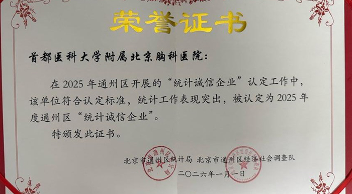 北京胸科医院荣获2025年度通州区“统计诚信企业”称号