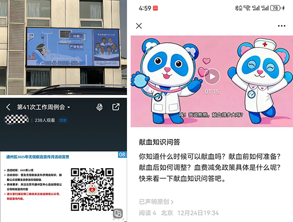 为积极响应北京市卫生健康委关于无偿献血宣传月的工作要求,深入落实《中华人民共和国献血法》《北京市献血条例》,进一步弘扬无偿献血公益精神,筑牢无偿献血工作根基,北京胸科医院在2025年12月通过丰富多样的形式,广泛宣传无偿献血的重要意义,普及科学知识,进一步提升公众对无偿献血的认知度和参与意愿。