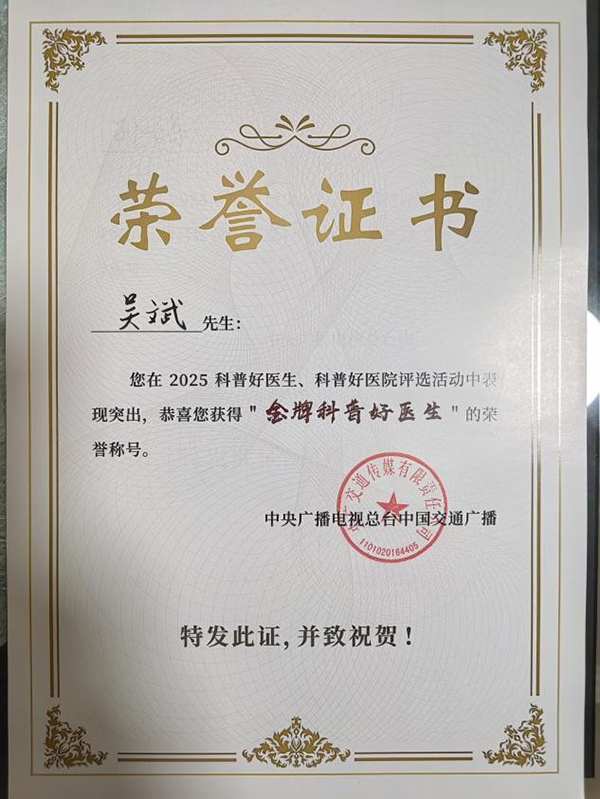 近日,由中央广播电视总台中国交通广播、云听APP联合中国医院协会共同主办的“2025 科普好医生、科普好医院优秀案例推选活动”圆满收官。首都医科大学附属北京胸科医院口腔科副主任吴斌凭借深厚的专业底蕴、创新的科普实践与广泛的社会影响力,从全国269名参评医生中脱颖而出,成功斩获“金牌科普好医生”殊荣,成为口腔健康科普领域的标杆人物,为我院科普工作再添亮眼成绩。