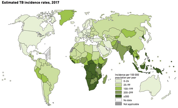 图:这张地图来自世界卫生组织2018年结核病报告,显示了结核病的流行地区