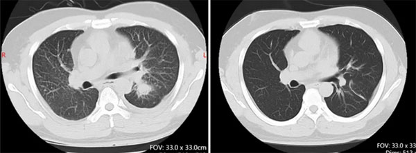 靶向治疗前左肺下叶肿块25mm;靶向治疗后左肺下叶肿块5mm